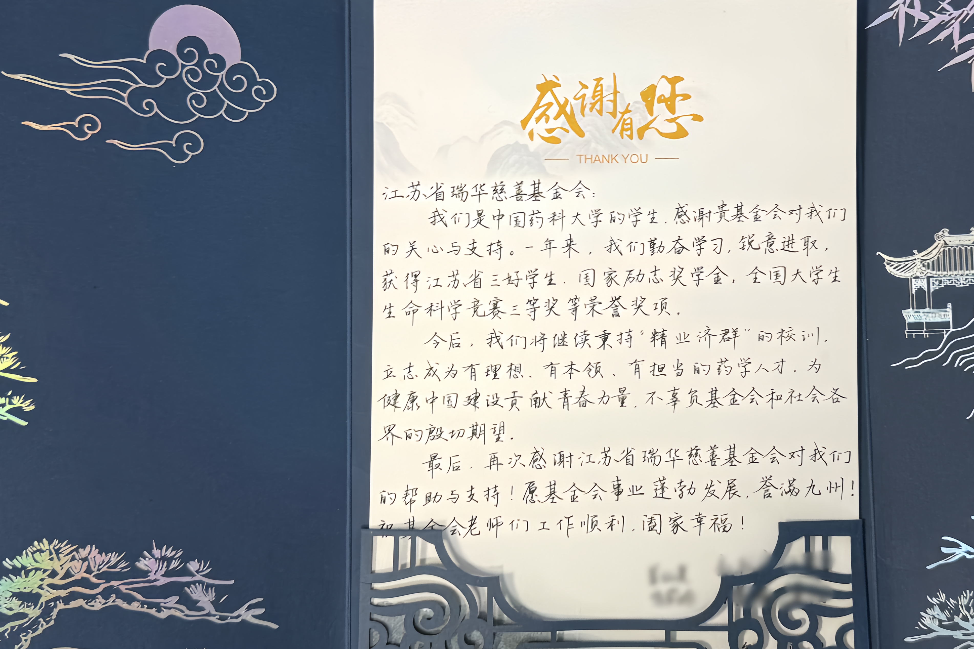 新年伊始,江苏省瑞华慈善基金会收到了一封来自中国药科大学的感谢信,6名“瑞华启梦助学金”受助学子代表发来喜讯。 2025年,他们勤奋学习,锐意进取,获得国家励志奖学金、全国大学生生命科学竞赛三等奖、江苏省三好学生等荣誉。 信中,他们还表示,“今后,我们将继续秉持‘精业济群’的校训,立志成为有理想、有本领、有担当的药学人才,为健康中国建设贡献青春力量,不辜负基金会和社会各界的殷切期望。” -